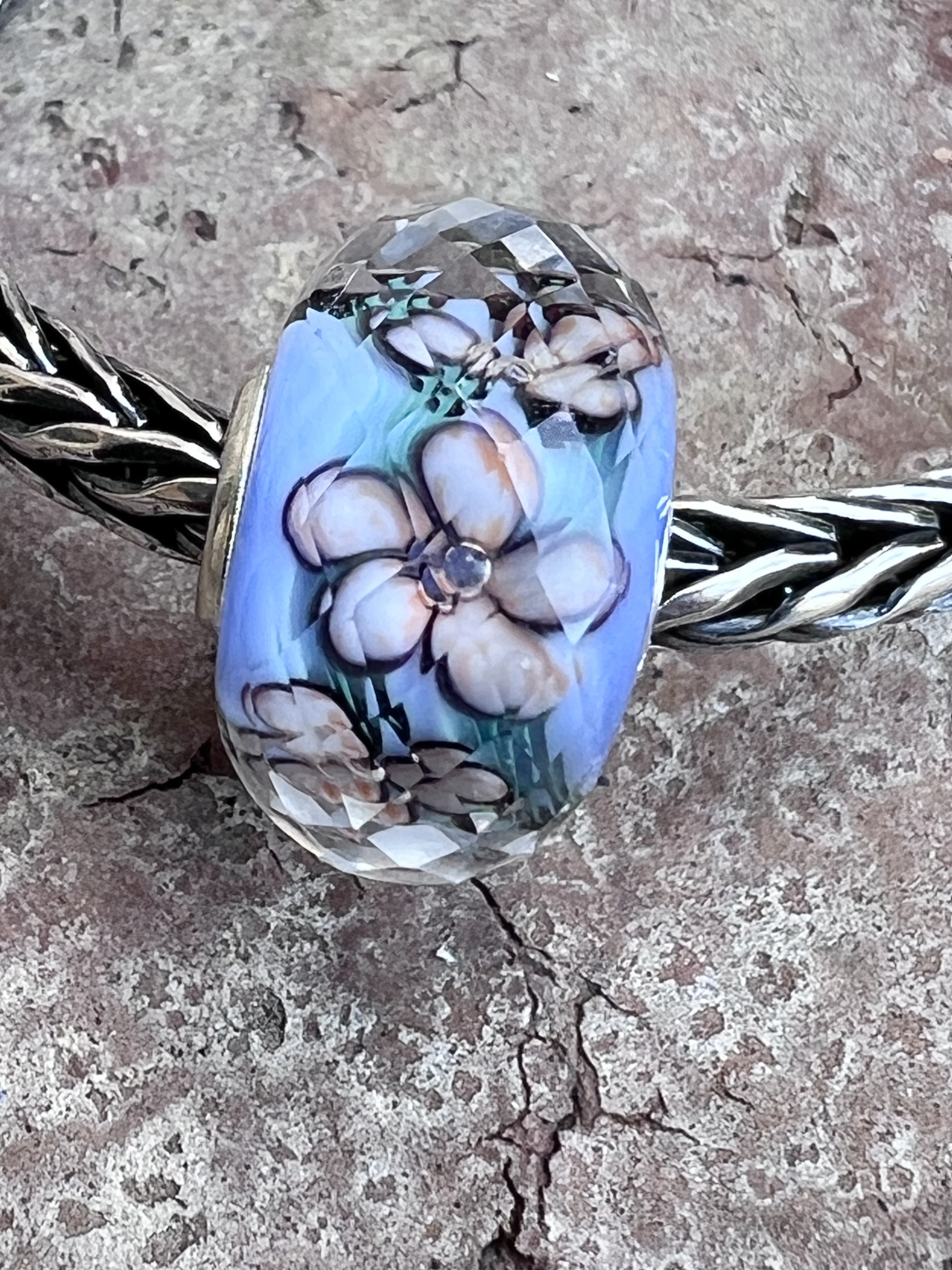 This gorgeous faceted unique has peach flowers on a Periwinkle base. The flowers have an air bubble at the center. There are also some green leaf details.