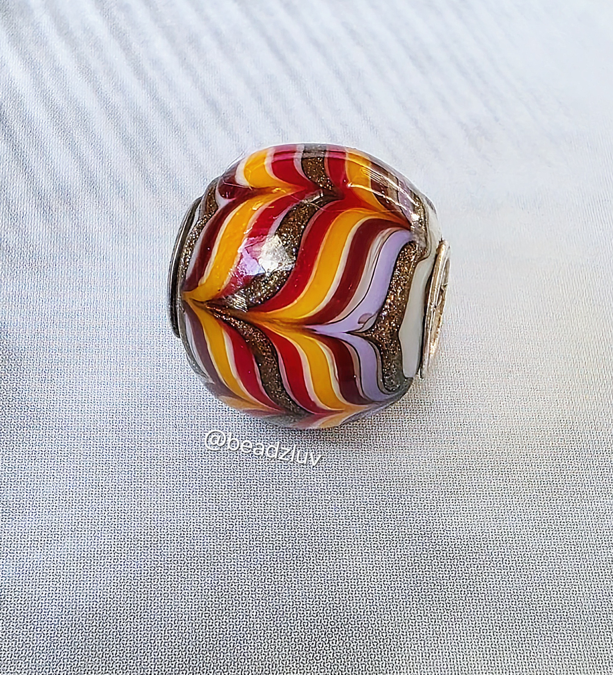 - A vibrant bead featuring flowing ribbons of golden yellow, deep red, burgundy, and purple swirling through a glittery bronze base like autumn leaves caught in the wind.